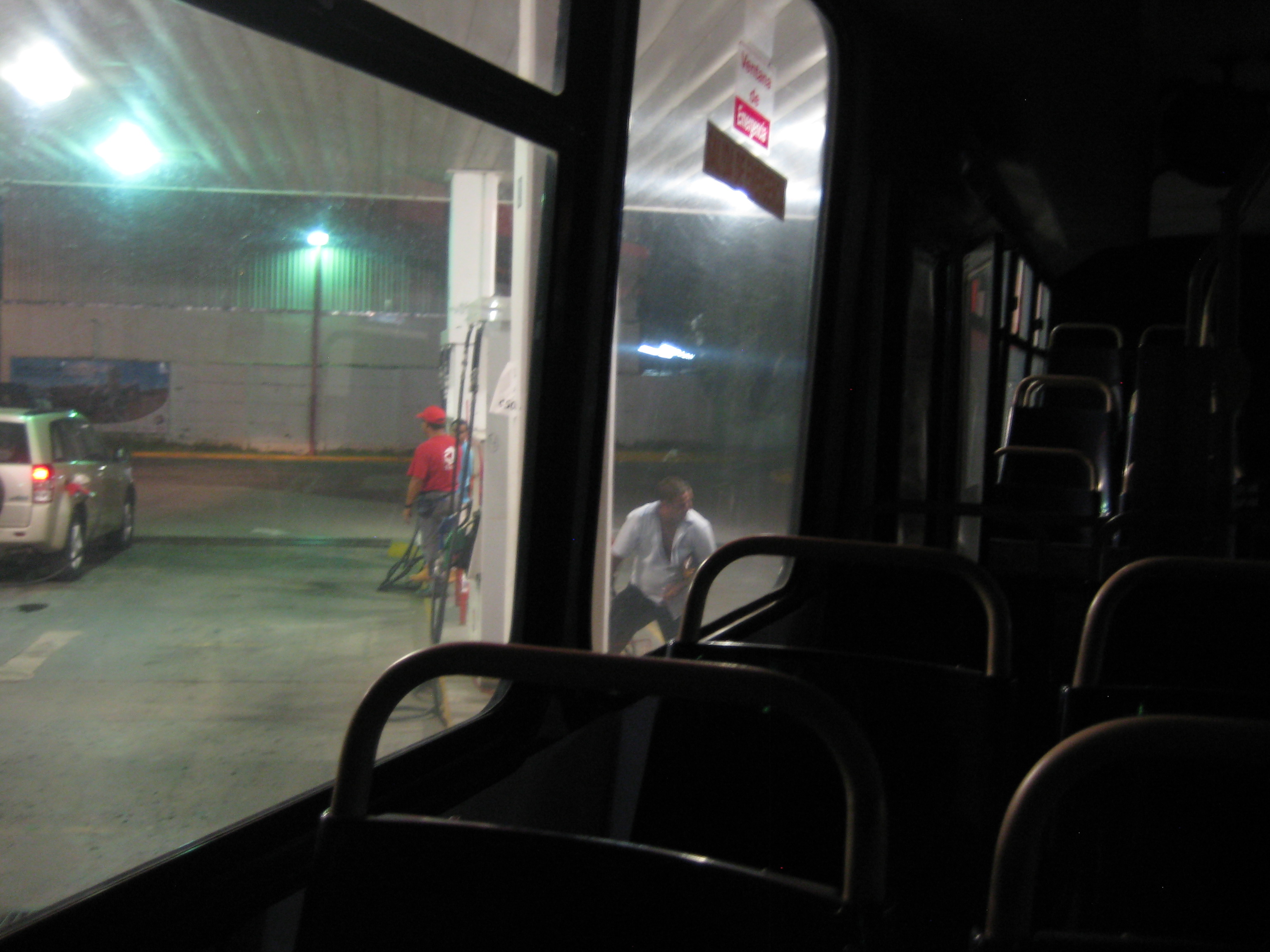 Abruptly and unannounced, we pulled into a gas station. The man in the stairwell exited, struck conversation with the fuel attendant, who reached in the trash for a container. After spraying something in it, they proceeded to the back of the bus, then announced something I could not decipher. Locals stood, were handed colones and exited rapidly, as if infested with scorpions. The driver also stepped off. The only thing I knew to do was document with survival selfies, and giggle in the dark Costa Rican bus, alone, unsure what was next.